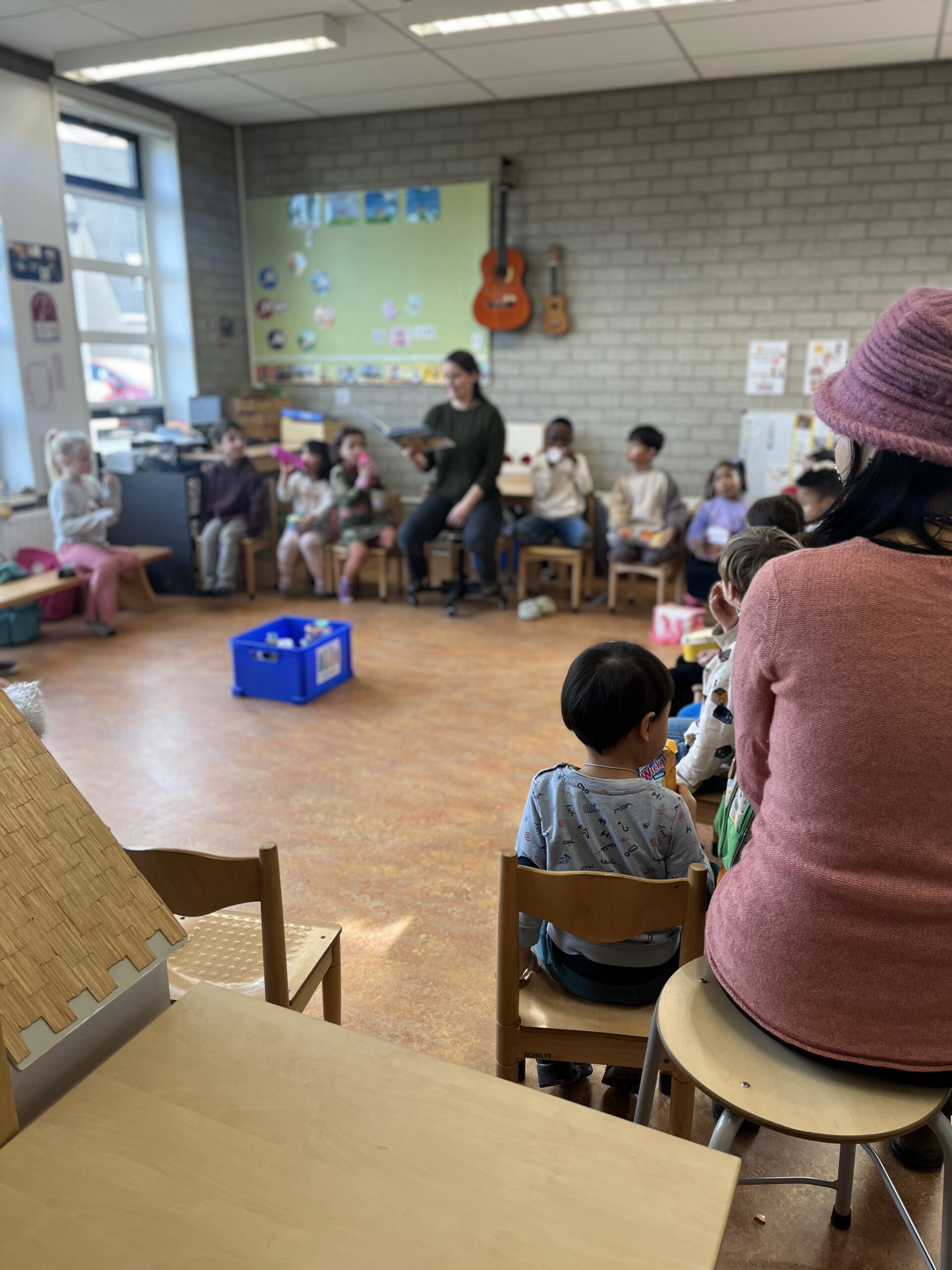 Na het buitenspelen gingen we met zijn allen naar de kleuterklas. In de kring het fruitmoment en ondertussen een verhaal voorgelezen door de juf! Toen alle appeltjes, bananen en mandarijntjes op waren, zijn we lekker in de hoeken gaan spelen.